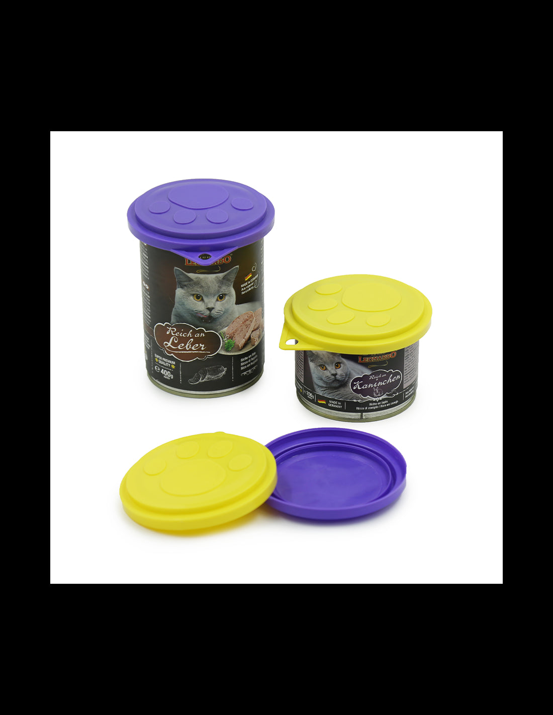 La tapa para latas de comida de hey! para mascotas esta hecha de plástico de color amarillo y morado. Estas tapas de latas ayudan a mantener las latas de comida para mascotas frescas por más tiempo.